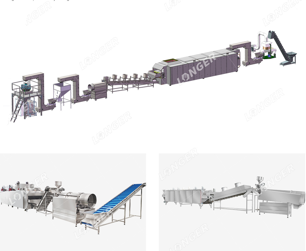 Peanut Roasting Cooling Seasoning Production Line is mainly used for roasting and seasoning granular materials such as peanut, almond, broad bean, cocoa bean, melon seed, nut, wheat, barley, oat, soybean etc.The equipment have roasting and cooling functions, suitable for batch continuous production. The equipment is driven by a big stick chain in the net belt tiled material forward, the roasting part through the hot air through the material layer and material heat exchange to achieve high quality baking, the cooling part through the cold air through the material layer and material heat exchange to achieve rapid material cooling. The chain plate type conveying structure makes the material progress gently, eliminates the peeling phenomenon caused by the rolling friction between the materials. The material color and lustre after roasting is uniform, without any damage.